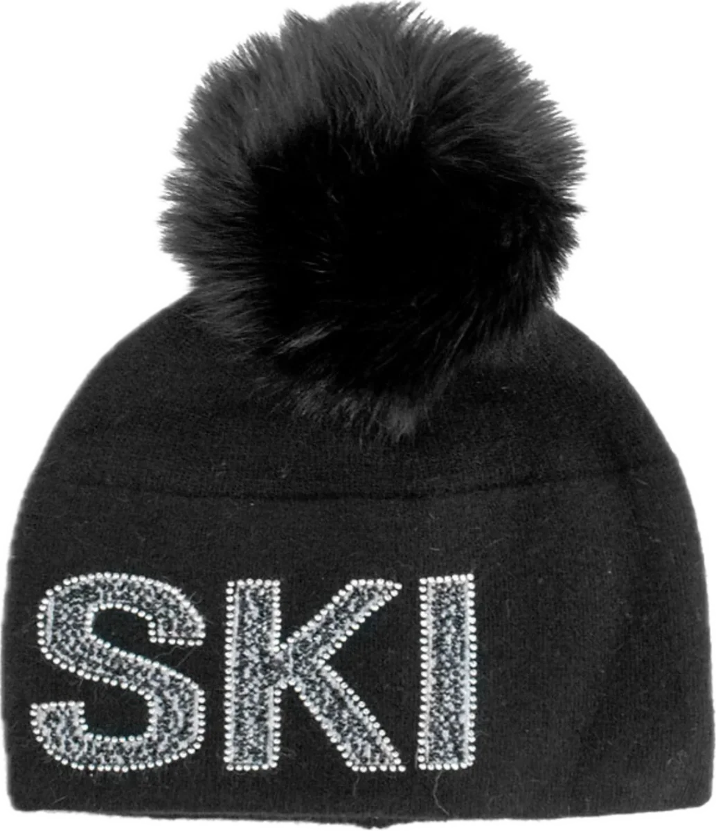 TUQUE NOIR EN TRICOT « SKI » AVEC CRYSTAUX ET POMPOM EN FOURRURE DE RENARD